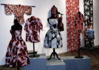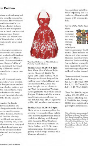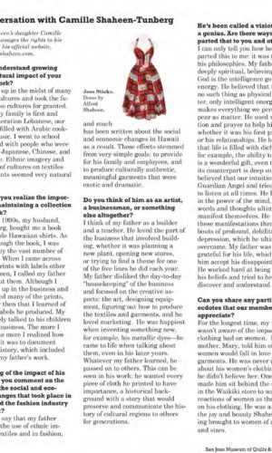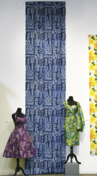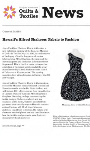 「ハワイのアルフレッド・シャヒーン:ファブリックからファッションへ」というタイトルで開催された展示は、シャヒーンが40年以上にわたりオアフ島で製作したハワイアンテキスタイルとアロハウェアを紹介する回顧展でした。SJMQ&Tキュレーターのデボラ・コルシーニさんとハワイアンテキスタイル研究家のリンダ・アーサー博士が共同で企画しました。